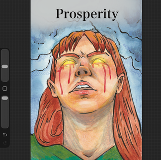 After having a second chance of revisiting Prosperity, I wanted to improve the front cover doing so with watercolour coloured pencils and coloured pens, I wanted the main character to be the focus of the illustration to show the readers that this is a story we’re listening to. I want the audience to understand genre therefore I didn’t magical elements to the eyes and adding to the mystery of white blood is coming out of her eyes.
