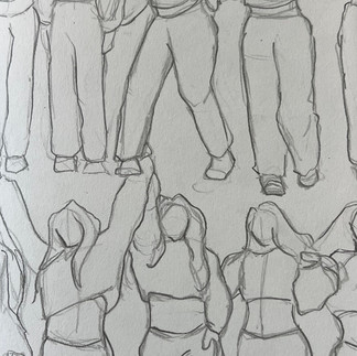 Lay the action plan and images somewhere that you can look at them altogether. Arrange your composite drawings to create connections between them. You might have enjoyed a drawing of an interior or a figure and put that alongside a drawing that uses media in a particular way and decide to put them side by side. You could end up with clusters of images that are important to you for different reasons and drawings that connect from one sketchbook to another. There will be no wrong or right collections. Just collections that mean something to you.
