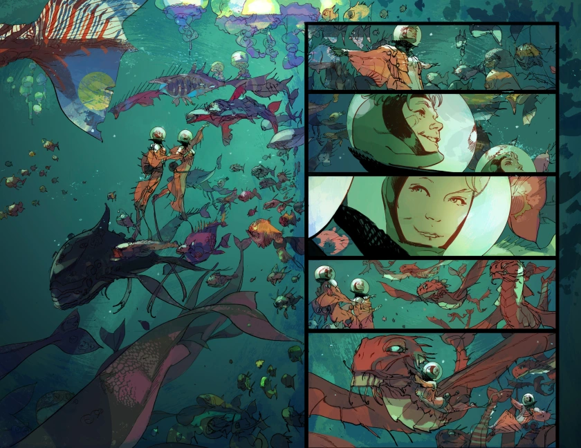 Style-wise, they also tend to rely on what artists and the writers would like for a style, dependent on their story and it's audience. An example I have, two different comics- same genre but different audience (and sub-genre), is 'Paper Girls' by Brian Vaughan and Cliff Chiang, and 'Low: The Delirium of Hope' by Remender and Tocchini. Paper Girls has a brighter colour scheme (pinks, brighter blues and purples) with reasonable about of texture. On the other hand, Low has a more unusual colour scheme (oranges, reds and blues) with lots of texture.
